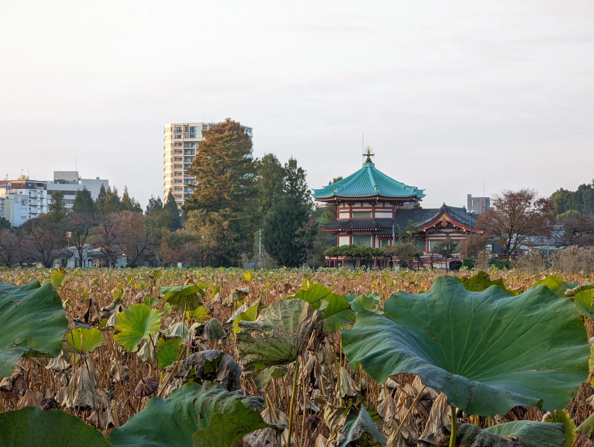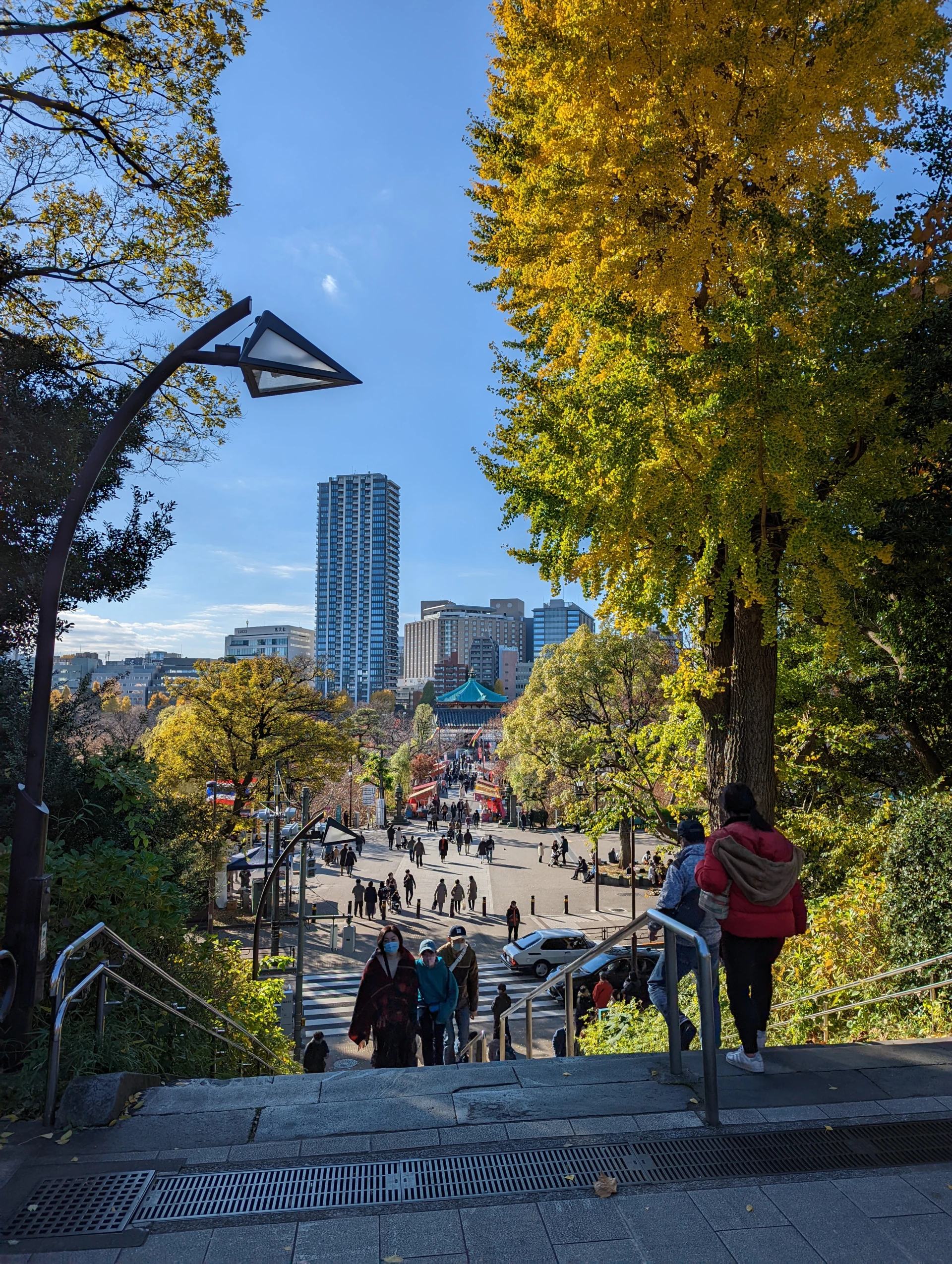 上野公園の石階段空見下ろす不忍池と神社。